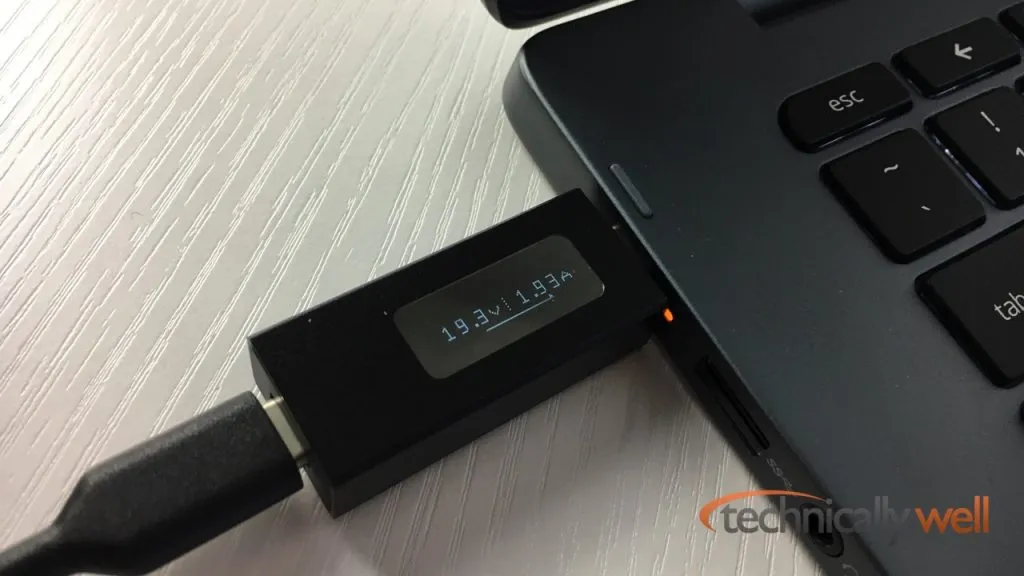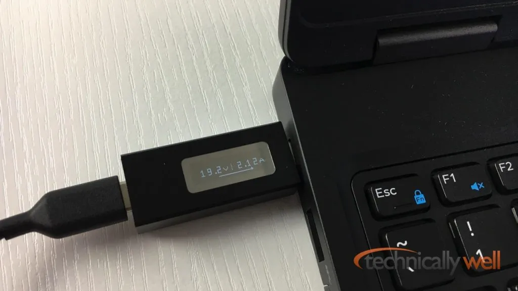 The Dell Latitude 5590’s stock charger is 65 watts. Although the Anker PowerPort Atom PD 2 only outputted about 40 watts (19.2V 2.12A) to charge the laptop in the photo below, the laptop did recognize it as a 60 watt charger (and complained that the 60 watt charger was not a “full speed” 65 watt charger). Despite the message, the laptop continued to charge while in use.