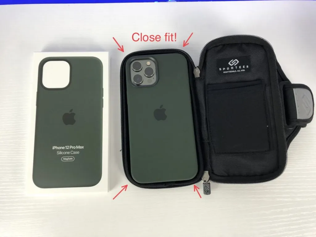 This armband by Sporteer features a zippered front pocket that makes it a lot easier to open fully so you can just lay your phone inside. The iPhone 12 Pro Max with the official silicone case fits inside, but just barely. A larger case, such as a protective Otterbox case, would likely be too large.