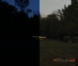 Night Vision: Infrared LEDs do not work through glass, which most outdoor cameras would use to provide the B&W night vision. However, the Panasonic HomeHawk camera uses a high-sensitivity camera that can “see” as long as there is at least 0.2 lux of light available (which, Panasonic states is slightly above total darkness). It does work surprisingly well: below is a comparison photo between my iPhone X’s camera and the HomeHawk Window camera.